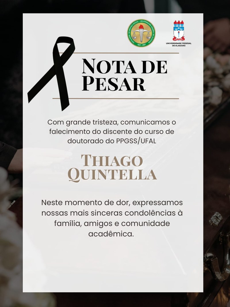 A Faculdade de Serviço Social (FSSO) da Universidade Federal de Alagoas (UFAL) manifesta seu mais profundo sentimento de pesar pelo falecimento de Thiago Quintella de Mattos, discente do Curso de Doutorado do Programa de Pós-Graduação em Serviço Social (PPGSS). Ao tempo, reconhece, com respeito e admiração, sua dedicação, seu compromisso e sua contribuição ao PPGSS durante o tempo em que esteve conosco. Neste momento de dor e saudade, registramos publicamente nosso apoio e nossas sinceras condolências aos familiares, aos amigos e as todas as pessoas que fizeram parte do seu caminho.