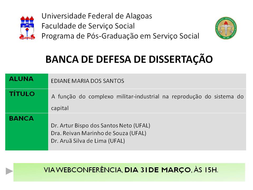 Banca de Defesa de EDIANE MARIA DOS SANTOSDevido o período de contingência da COVID-19, a banca foi realizada à distância, respeitando o isolamento social.https://fsso.ufal.br/pos-graduacao/servico-social/documentos/bancas-de-defesa/banca-de-defesa-de-ediane/viewhttps://fsso.ufal.br/pos-graduacao/servico-social/documentos/bancas-de-defesa/banca-de-defesa-de-ediane/@@images/image-1200-dfc0c326668e79b00cf66f8796a8ea05.jpeg