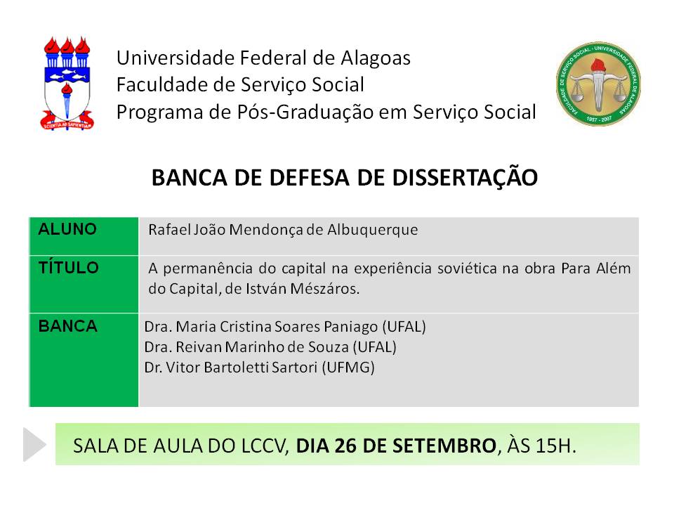Banca de Defesa de RAFAEL JOÃO MENDONÇA DE ALBUQUERQUEhttps://fsso.ufal.br/pos-graduacao/servico-social/documentos/bancas-de-defesa/banca-de-defesa-de-rafael-joao-mendonca-de-albuquerque/viewhttps://fsso.ufal.br/@@site-logo/logomarca-fsso.png