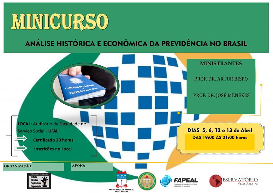 Minicurso "Análise histórica e econômica da Previdência no Brasil"Dias 5, 6, 12 e 13 de abril de 2018.https://fsso.ufal.br/pos-graduacao/servico-social/institucional/eventos/minicurso-analise-historica-e-economica-da-previdencia-no-brasil/viewhttps://fsso.ufal.br/pos-graduacao/servico-social/institucional/eventos/minicurso-analise-historica-e-economica-da-previdencia-no-brasil/@@images/image-1200-636baf0c76047b1fdd6ed937c967de0d.jpeg