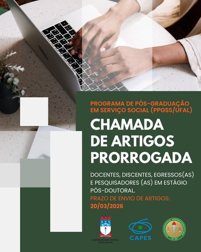 Prezadas/os docentes e discentes do PPGSS/UFAL, comunicamos a prorrogação do prazo para 20/03/2026 de envio de artigo para compor os e-books a serem publicados em 2026. Contamos com o empenho de vocês nessa iniciativa de socialização do conhecimento científico fruto dos estudos e das pesquisas desenvolvidas no âmbito do nosso Programa. São bem-vindas contribuições que problematizem, reflitam e desvelem criticamente a realidade social e a profissão em seus múltiplos aspectos, aprofundando o debate em torno das temáticas que compõem as linhas de pesquisa do PPGSS/UFAL. Atenciosamente, A comissão organizadora